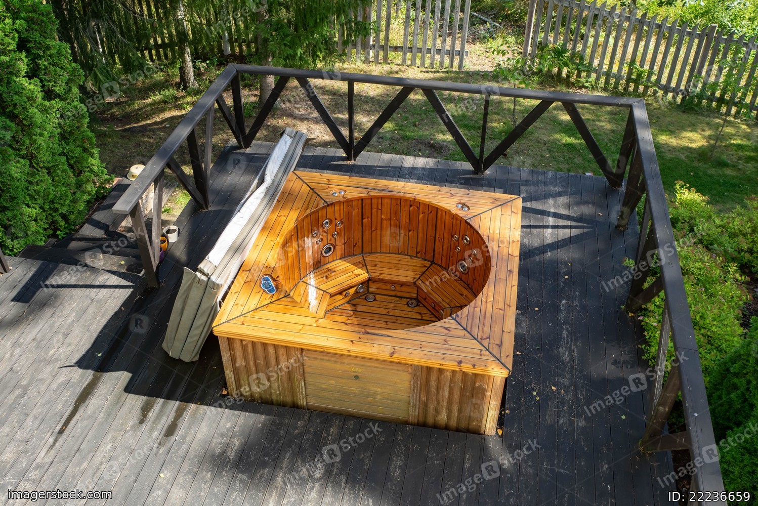 Top drone view of wooden terrace with wooden bath tub. Private garden.