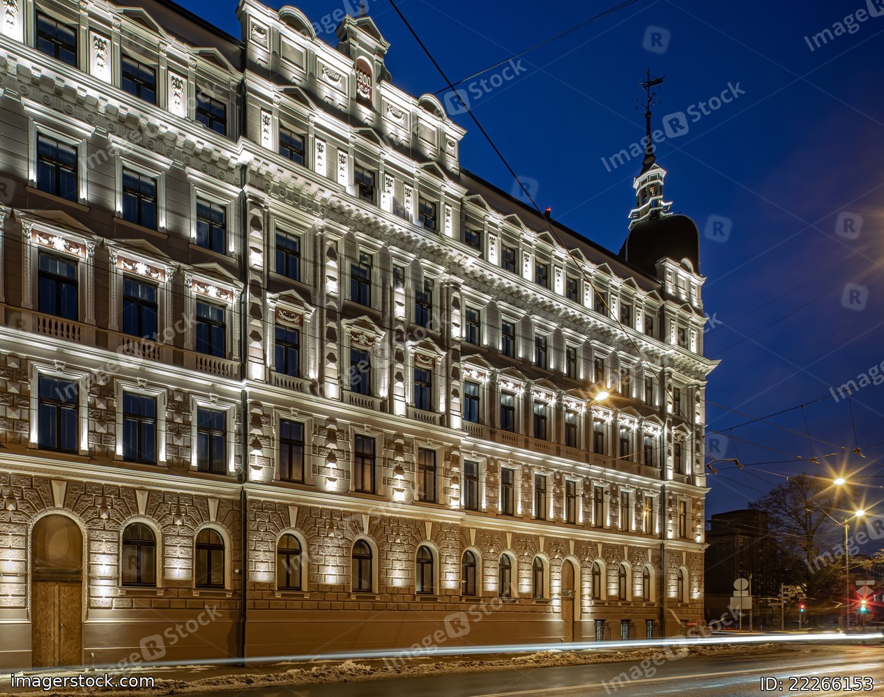 Night cityscape of Riga. Lights on long exposure. Illuminated building