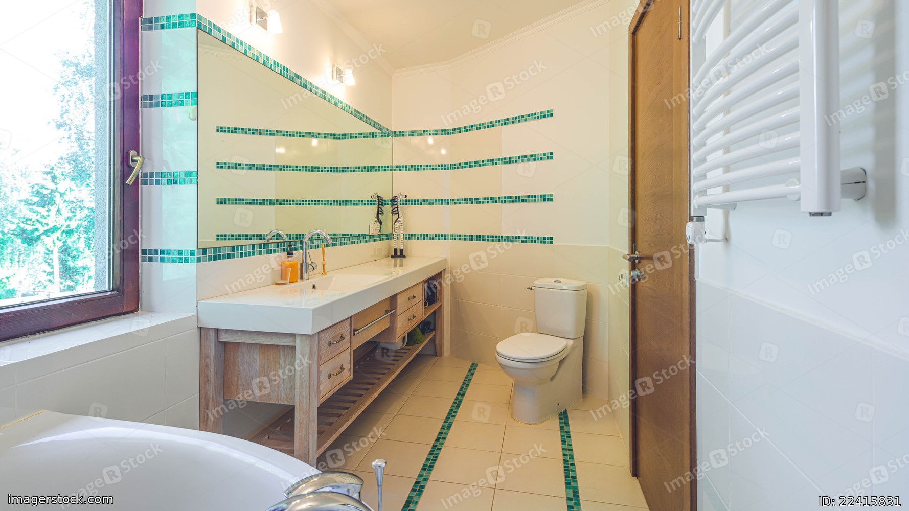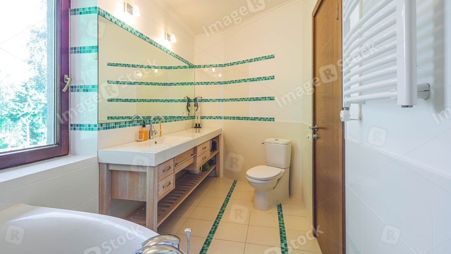 Modern interior of luxury bathroom in private house. Sink and mirror. Wooden drawers. White toilet.