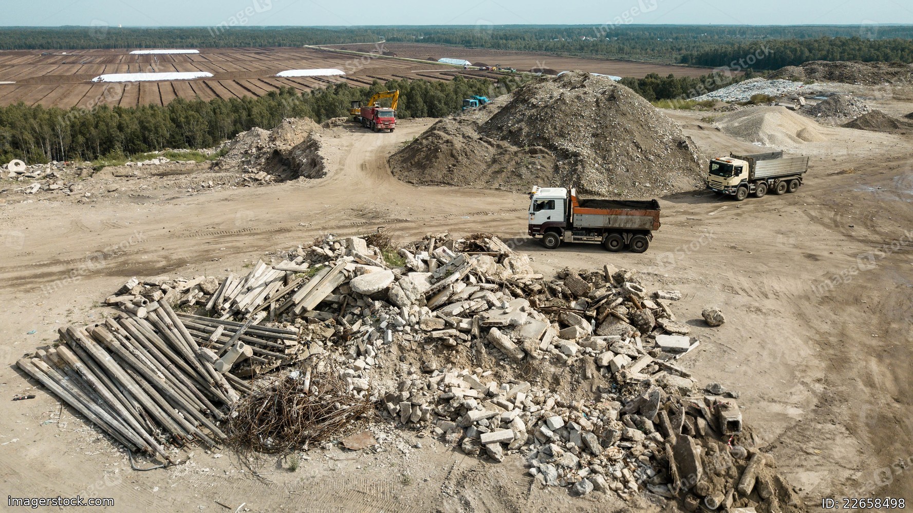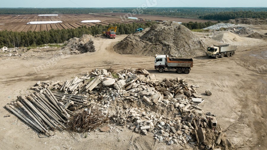 Aerial view of trucks near heap of waste on construction site. Fragments of concrete, wire, and rocks.