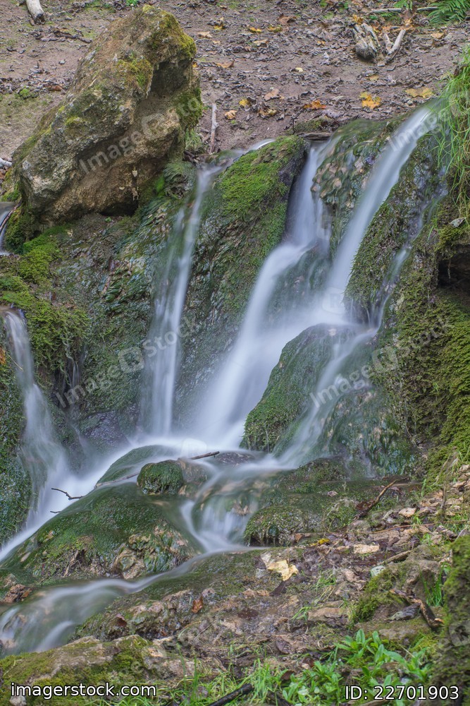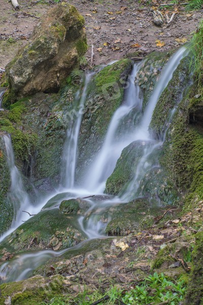 Waterfall in the forest. Green moss and stones. Summer.