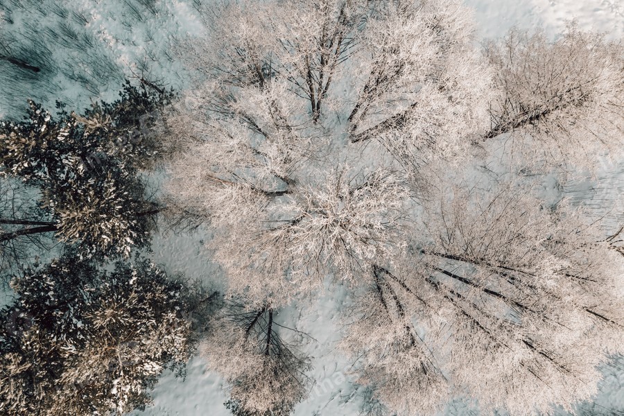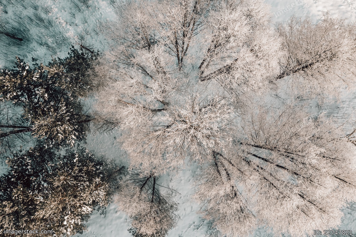 Aerial view of winter forest. Snowy naked trees. Beautiful nature.