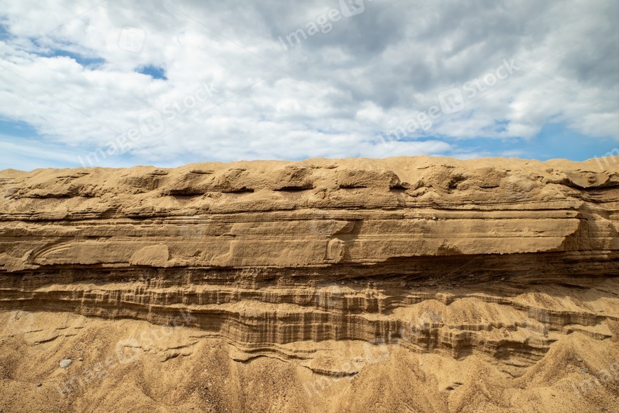 Scenic landscape. Sandy shore. Sand rock. Cloudy sky