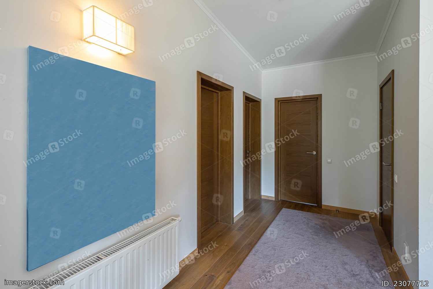 Contemporary light interior of hallway in private house. Wooden doors. White walls. Cozy apartment.