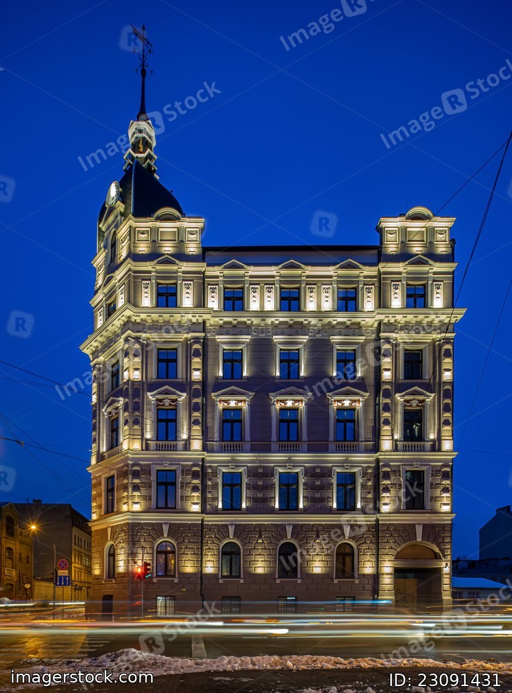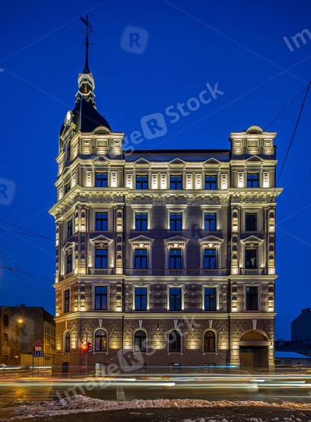 Night cityscape of Riga. Lights on long exposure. Illuminated building