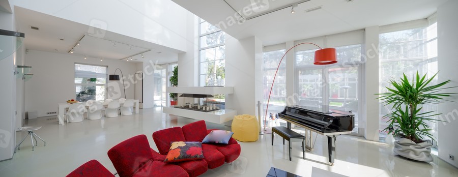 Modern interior. Luxury private house. Living room. Red sofa, piano