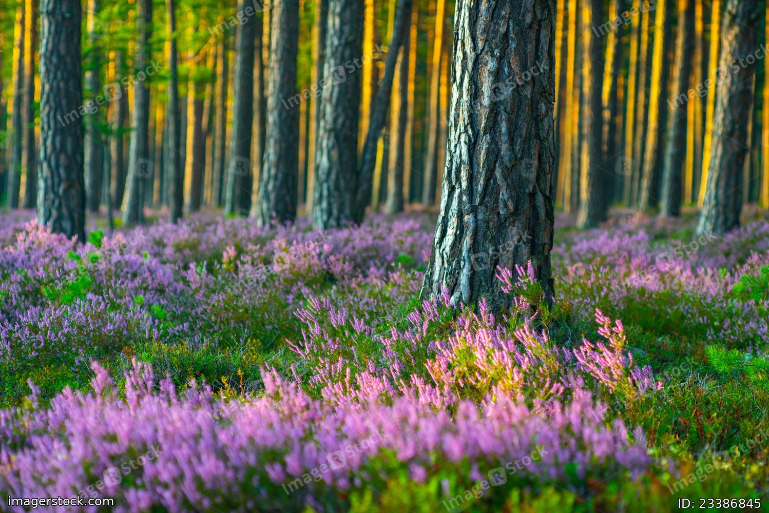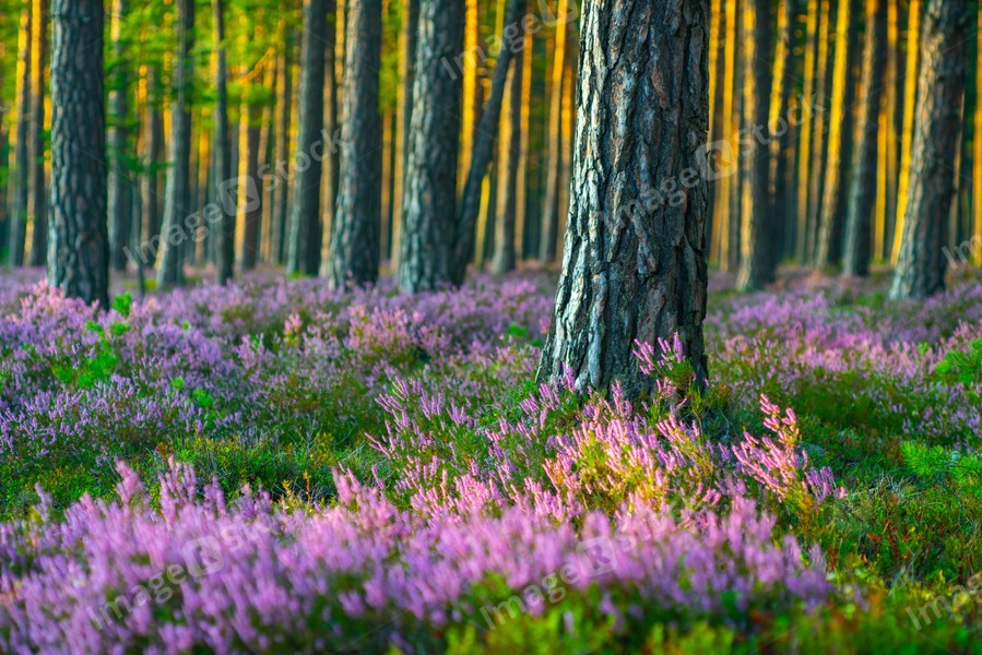Sunny day. Blooming heather. Beautiful lawn in the forest.