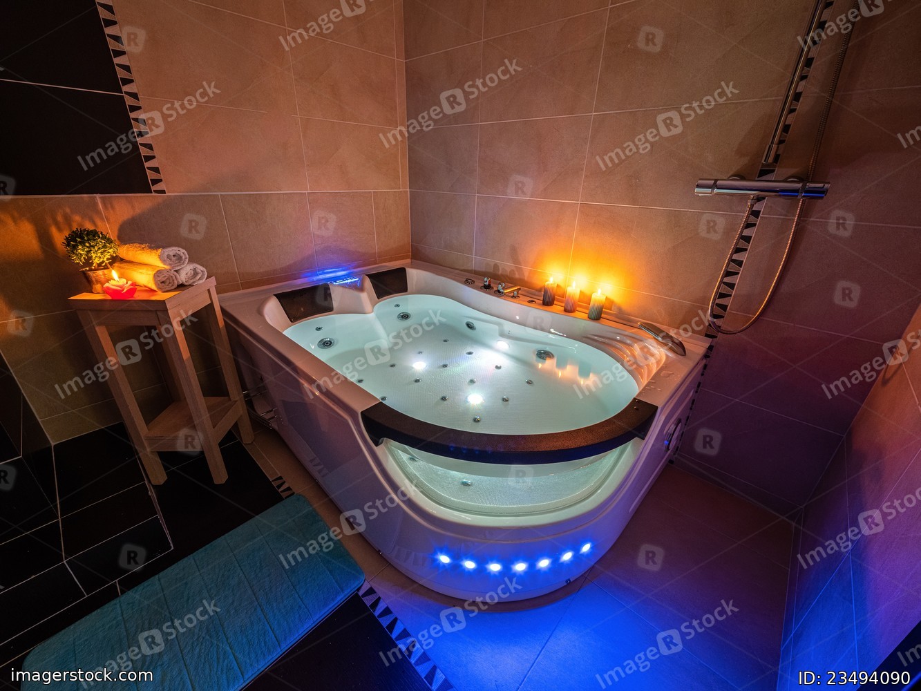 Illuminated massage bath with water. Luxury bathroom. Burning candles.
