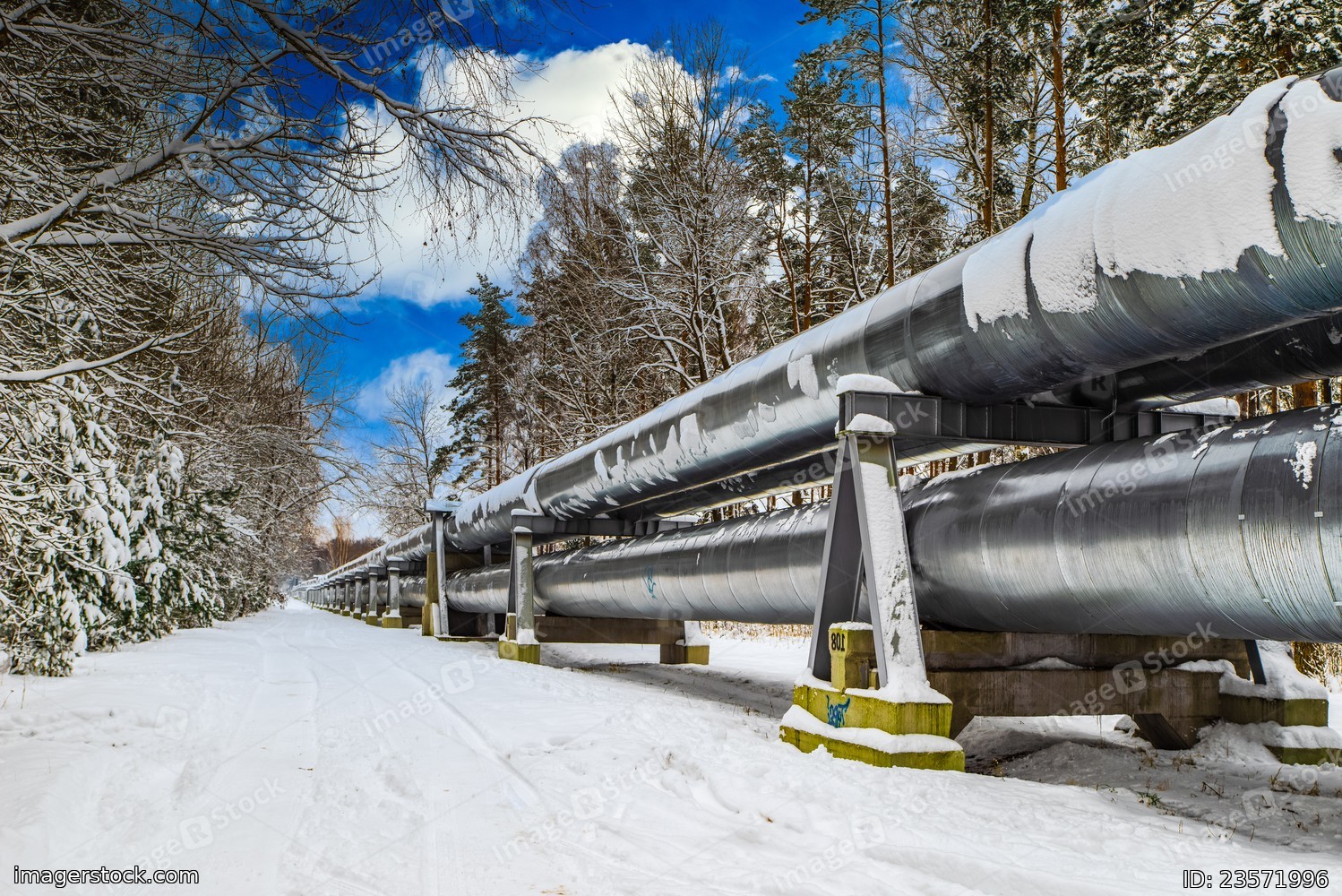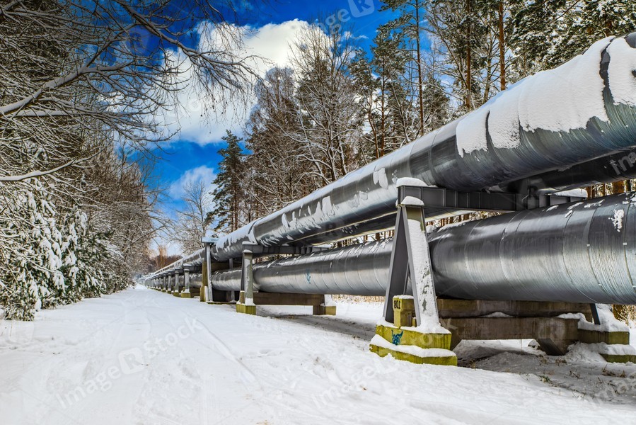 Huge industrial pipelines of central heating system. Snow on pipes.