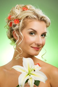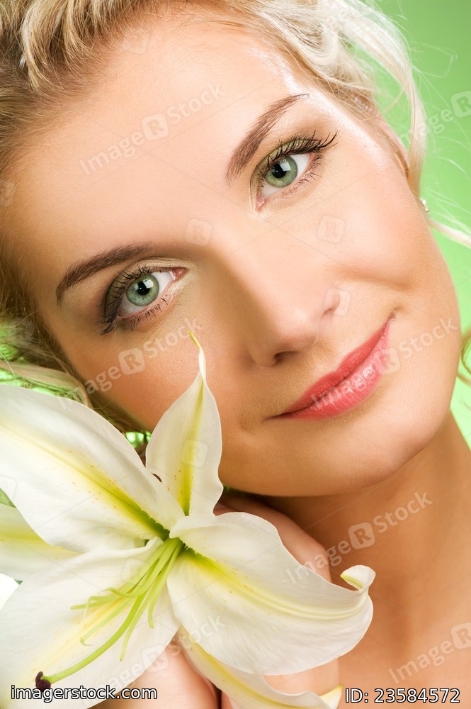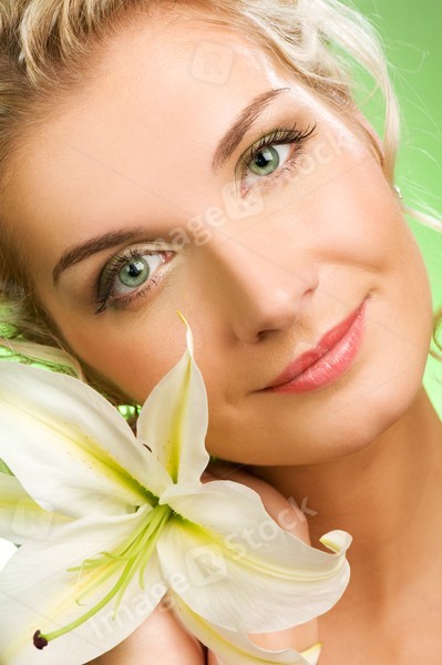 Beautiful young woman with lily flower. Close-up portrait