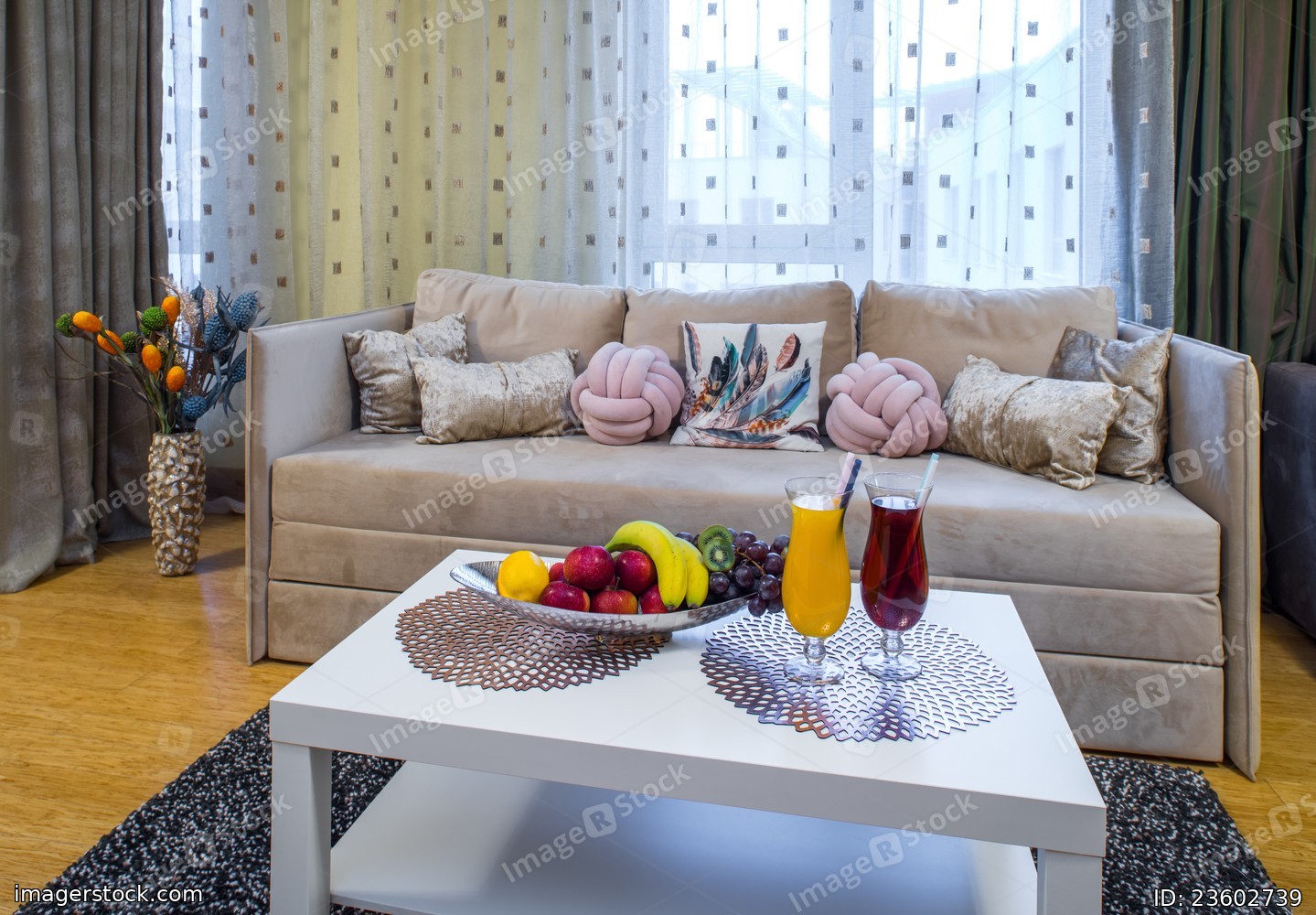 Romantic compositiom with drinks and fruits on the table. Cozy sofa.