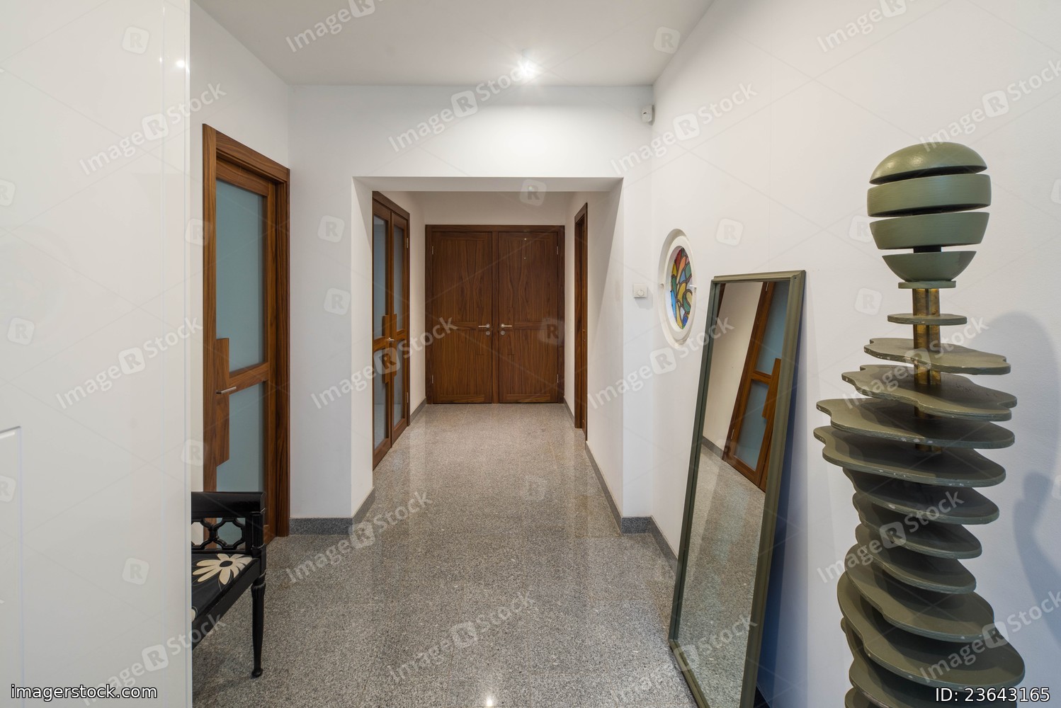 Modern interior of entrance hall with closed wooden doors. Mirror. Grey mannequin.