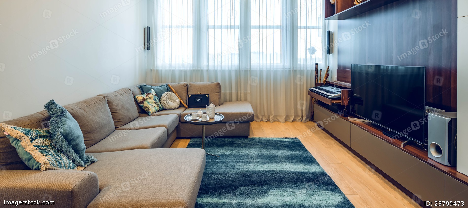 Contemporary interior of living room with cozy furniture. Window with tulle. TV on wall unit. Home decor.