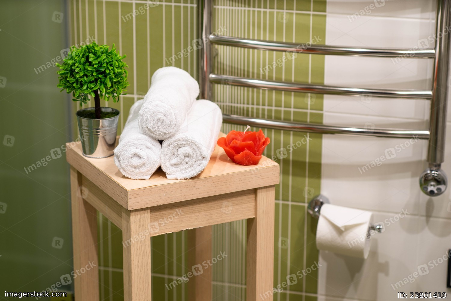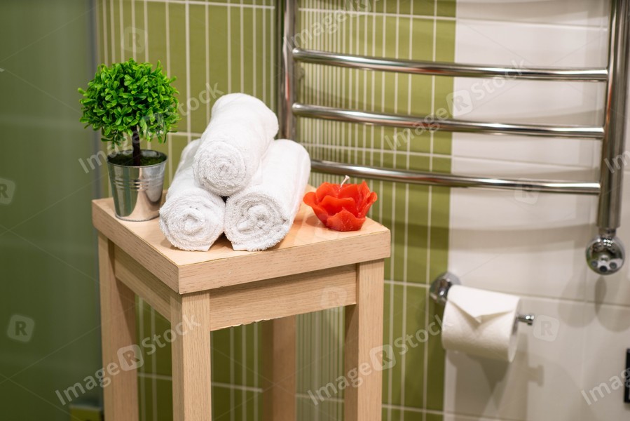 Bathroom. White towels. Candle. SPA composition.
