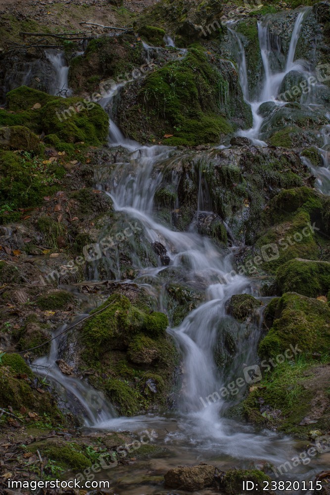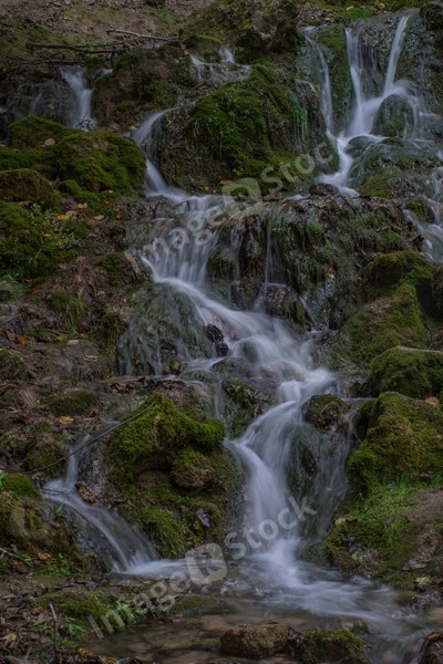 Waterfall in the forest. Green moss and stones. Summer.