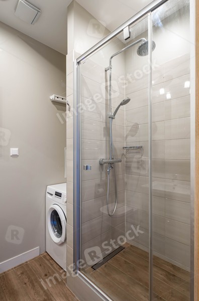 Modern interior in light tones of luxury bathroom. Shower cabin with glass sliding door. Washing machine.