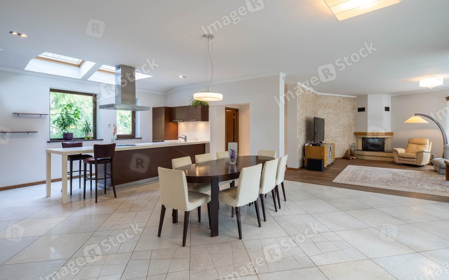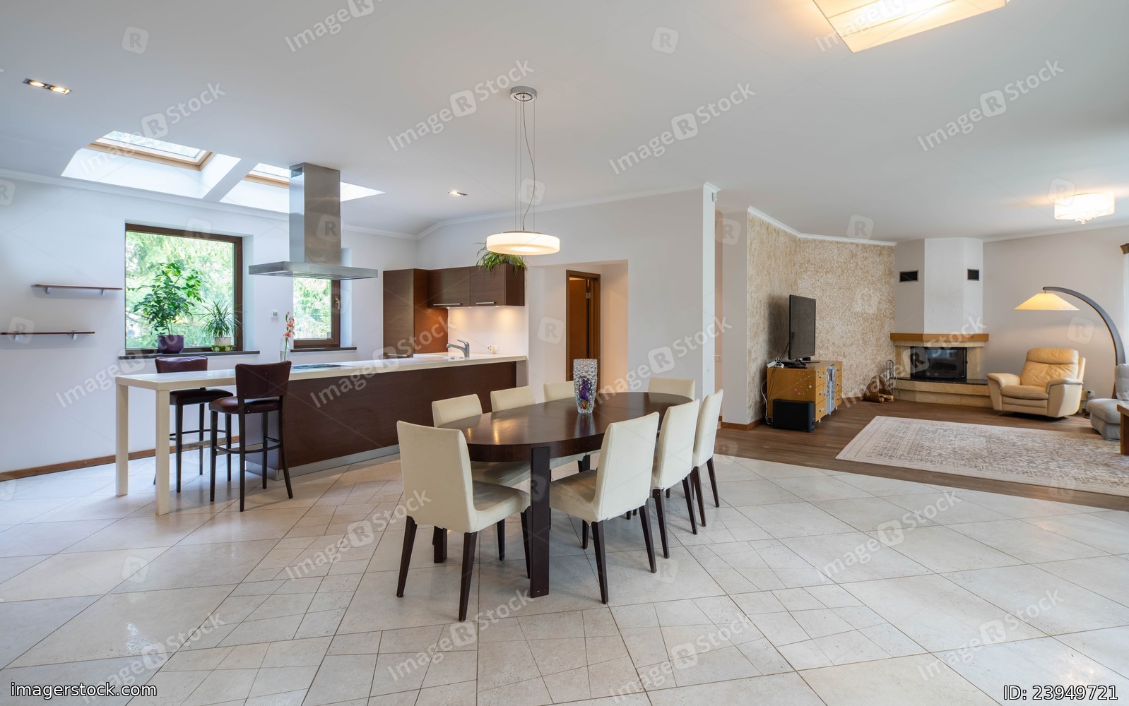 Contemporary interior of luxury apartment. Dark wooden table and cozy chairs. Kitchen set. Private house. Fireplace.