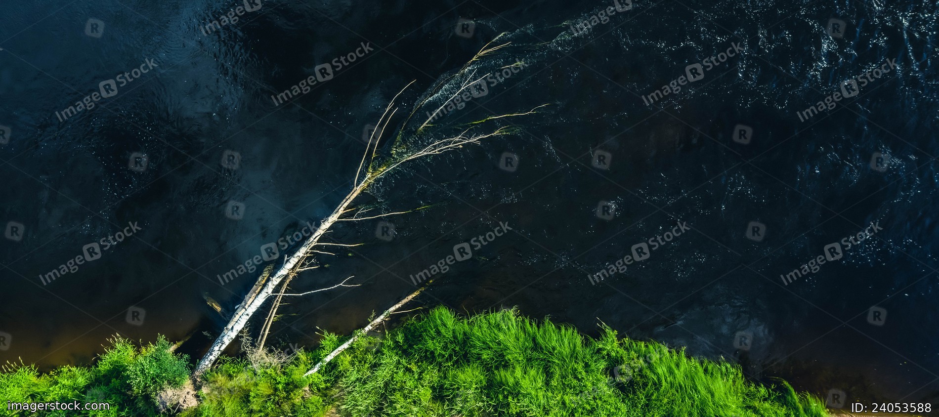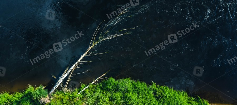 Drone landscape from above. Dry tree has fallen and lies in the fast flow of the river on the shore.