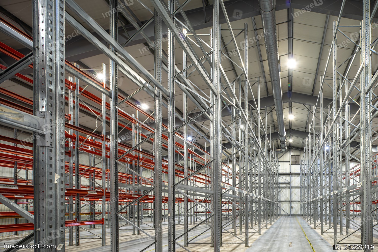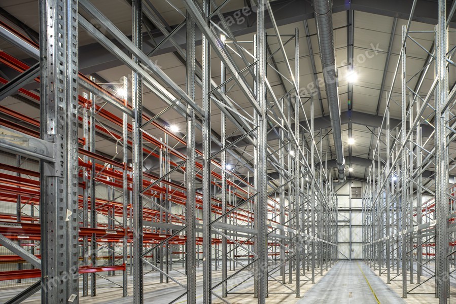 Interior of huge empty storehouse. Industrial warehouse racking.