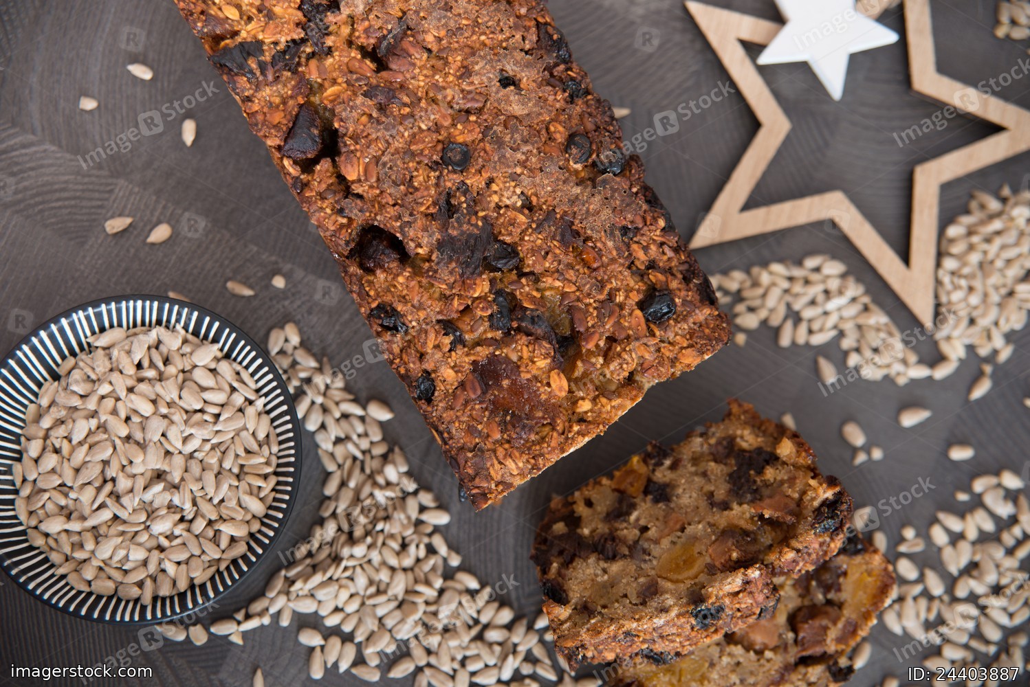 Homemade fruit bread with cosy winter decorations
