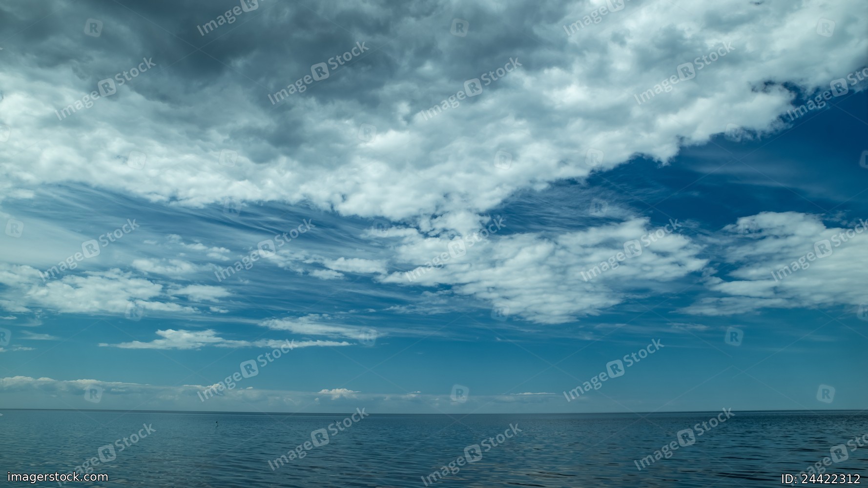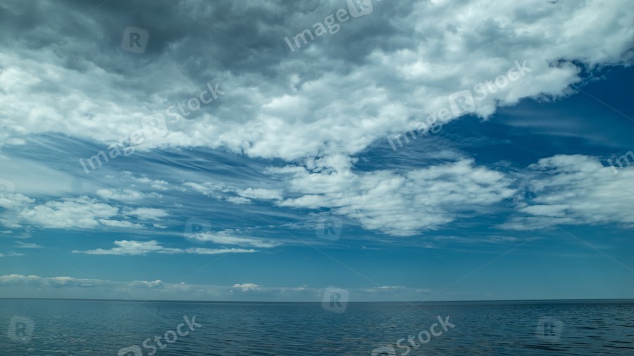 Scenic seascape of calm sea and blue sky with clouds.
