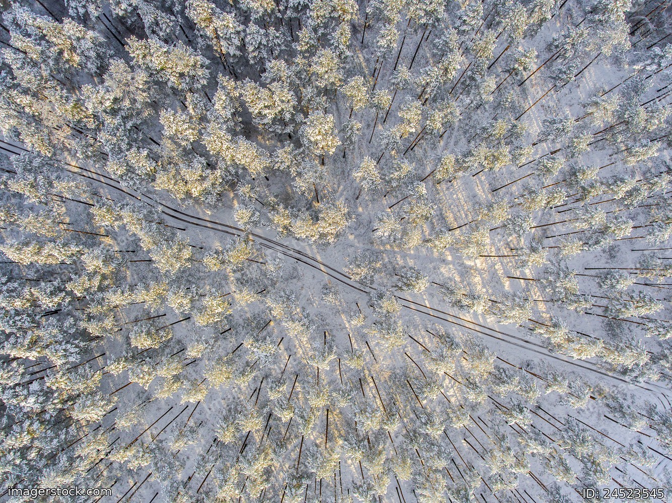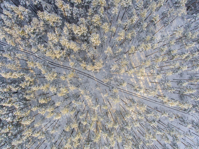 Aerial view of a winter forest in the snow.