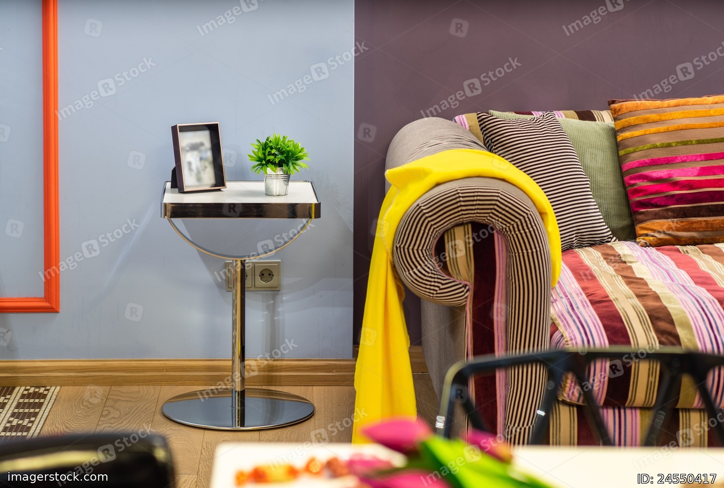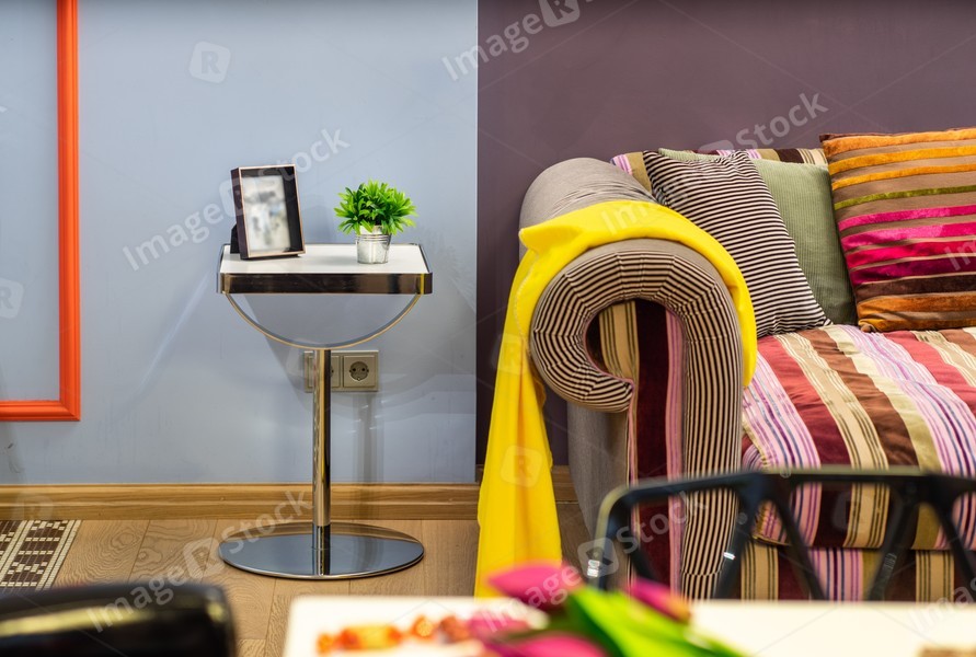 Close-up of cozy couch with pillows and yellow plaid. Stripes. Small table.