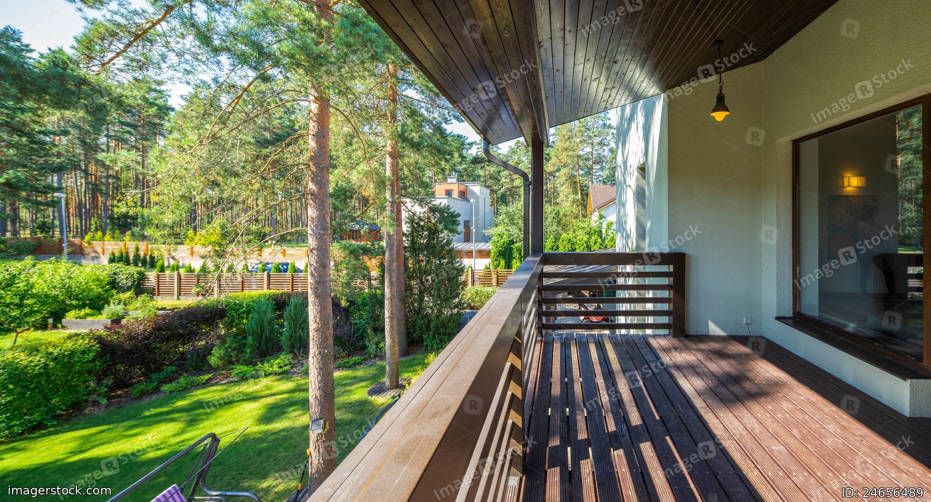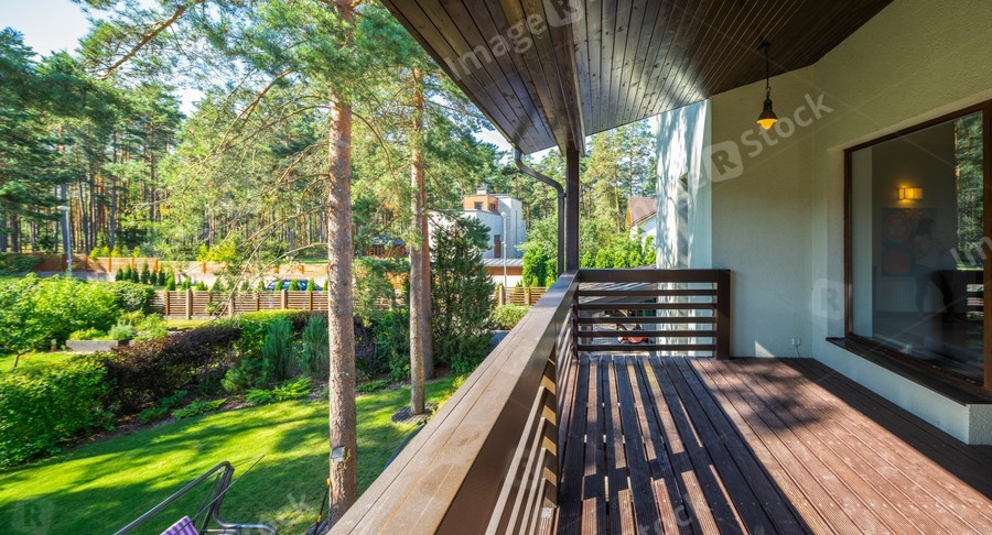 Modern wooden terrace in luxury cottage. Panorama window. Green garden with trees.