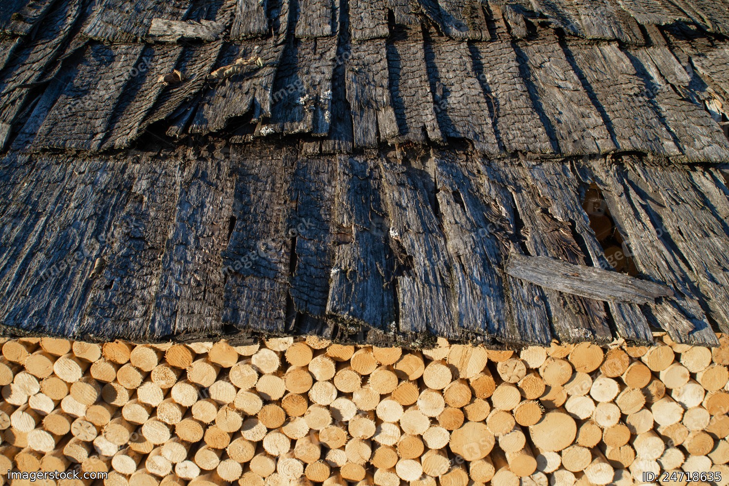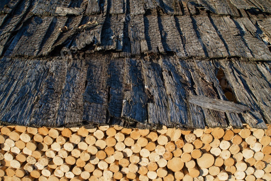 Many round logs in woodpile under an old wooden roof.
