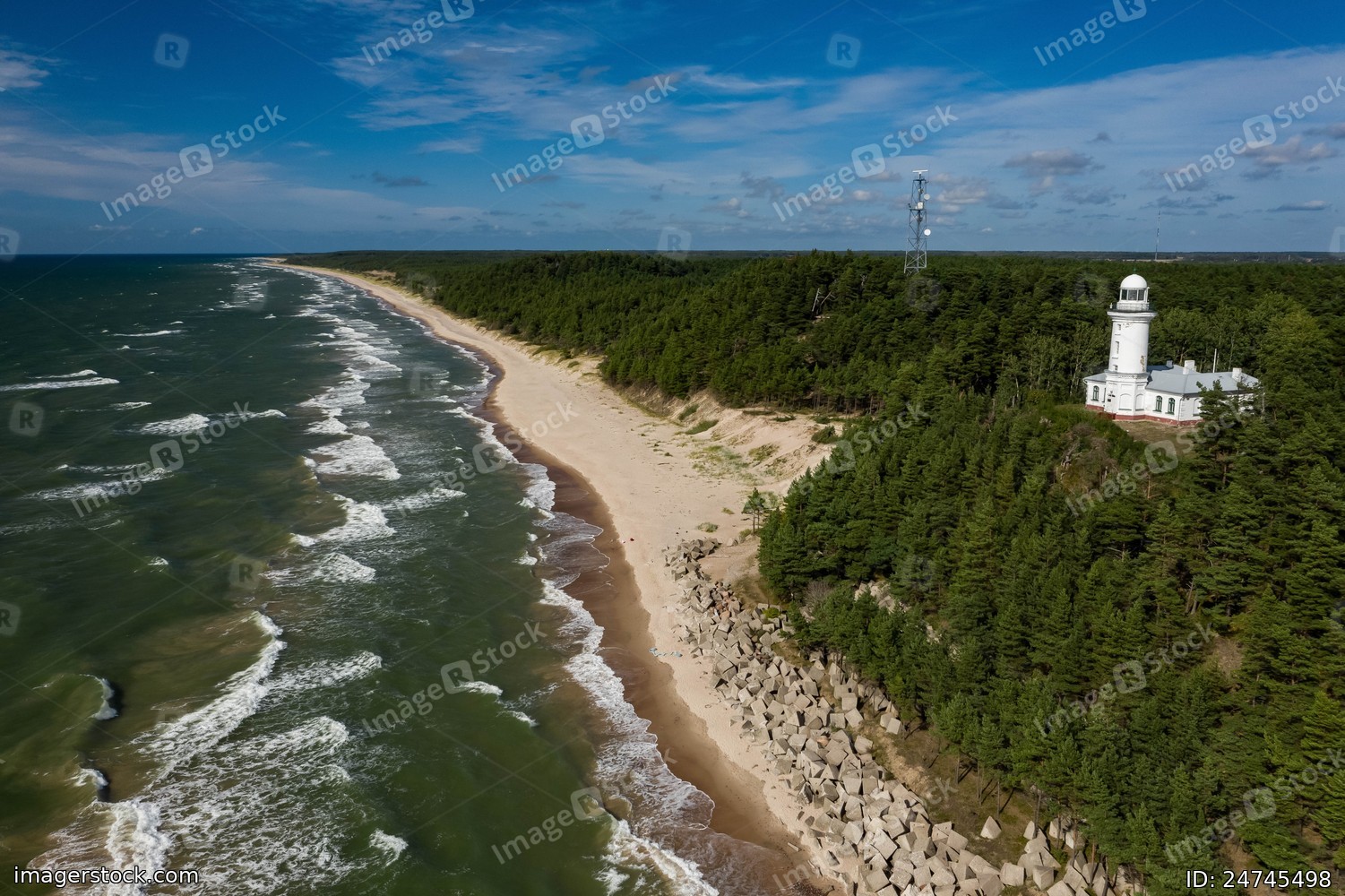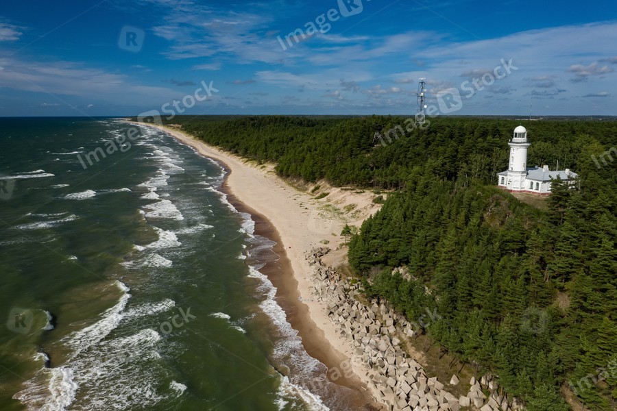 White Uzhava lighthouse on the shore of Baltic Sea. Sunny day.