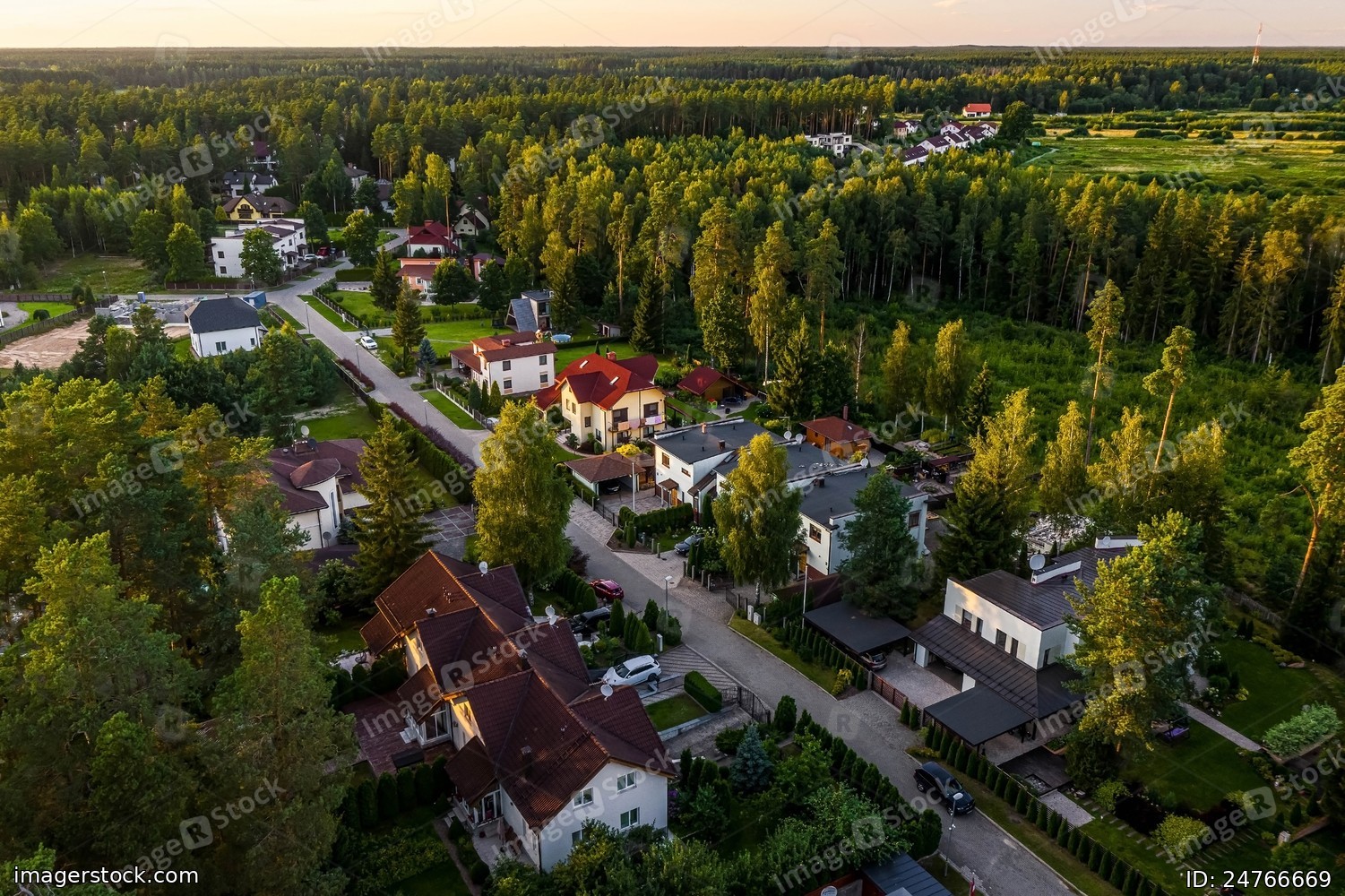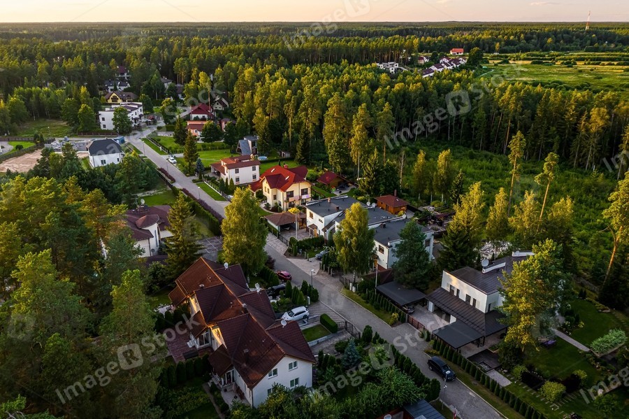 Top drone panorama view of luxury cottage village near green forest. Modern architecture. Private sector.