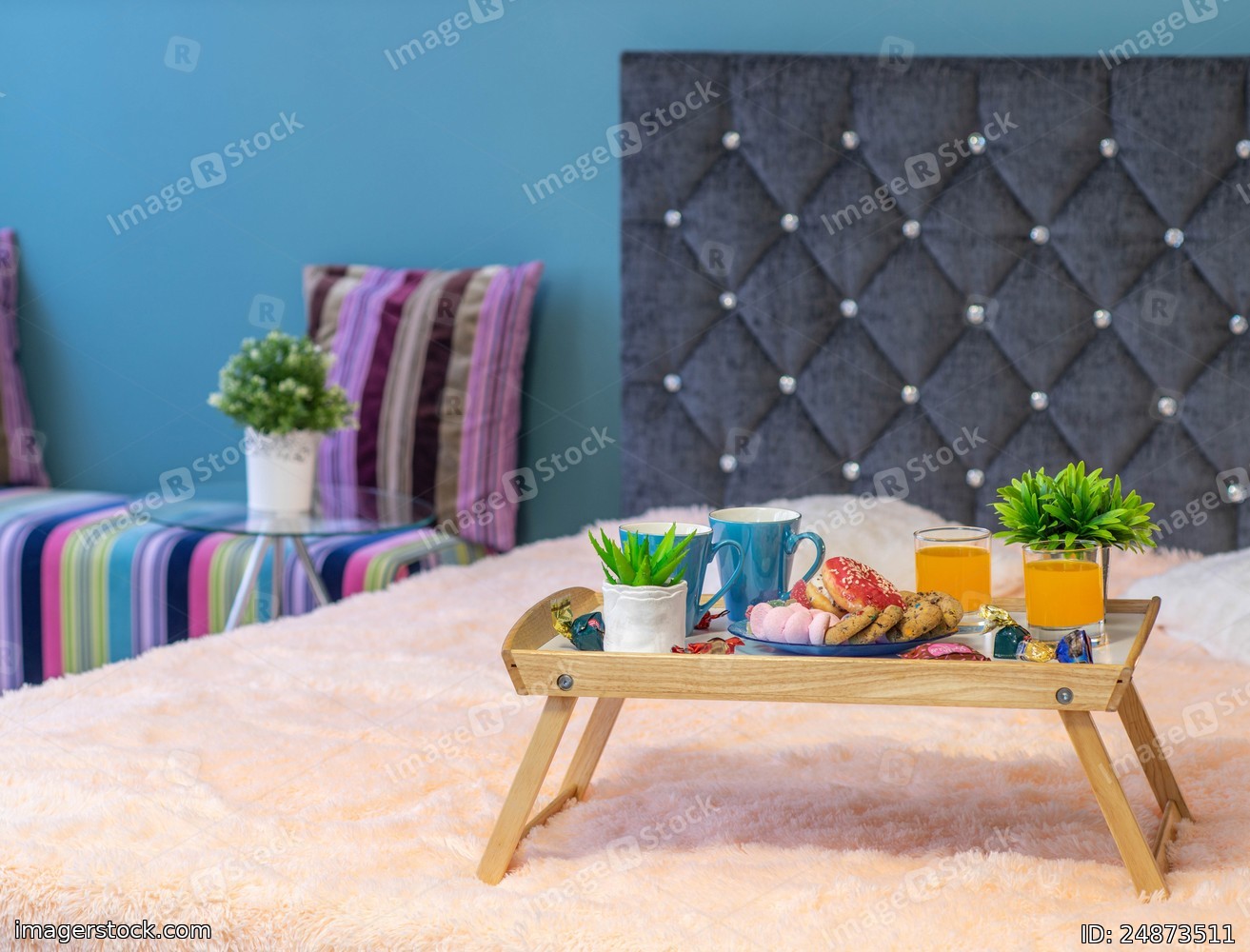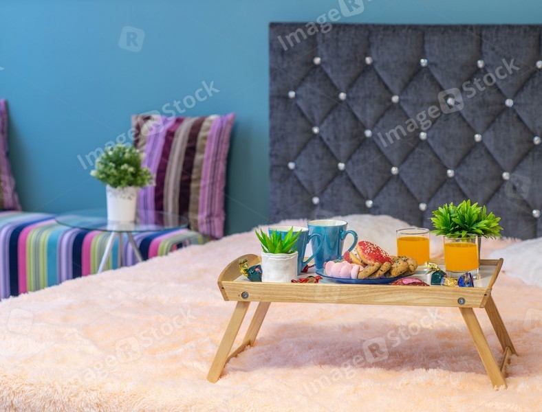 Close-up of tray with food. Romantic breakfast composition.