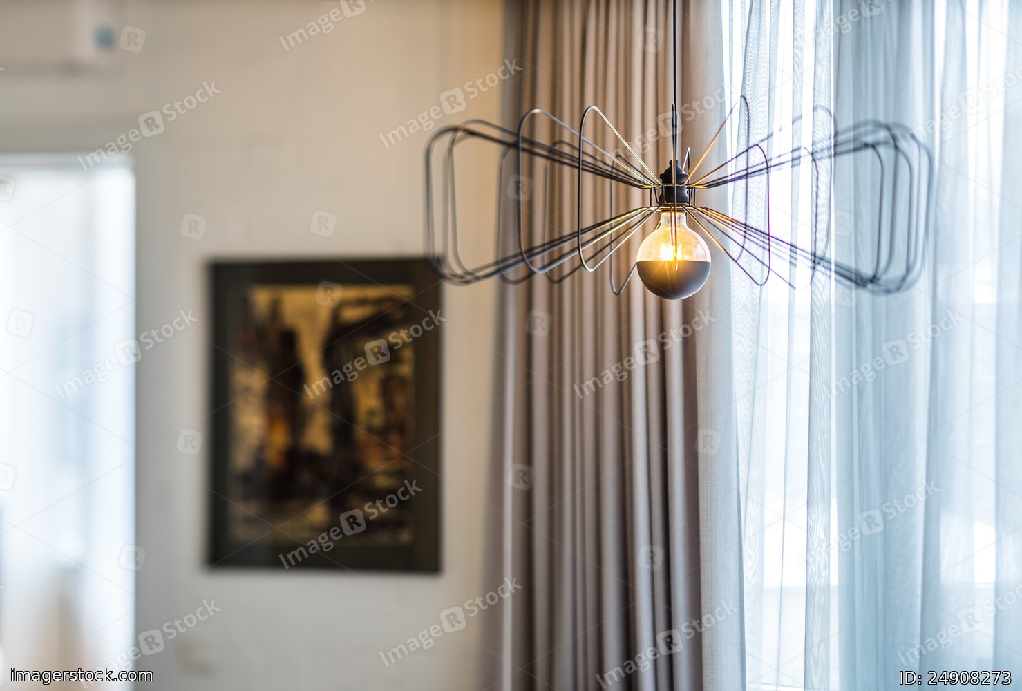 Interior of a modern apartment. Concrete ceiling and stylish lamp.