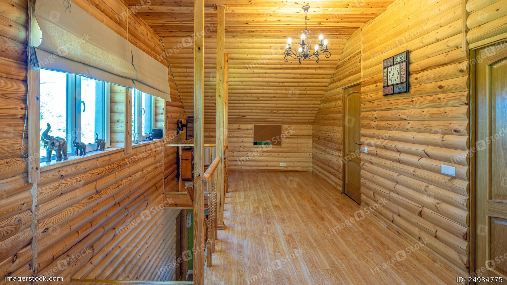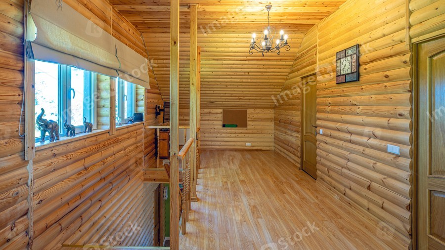 Hallway on the second floor in private country house. Eco Wooden interior.