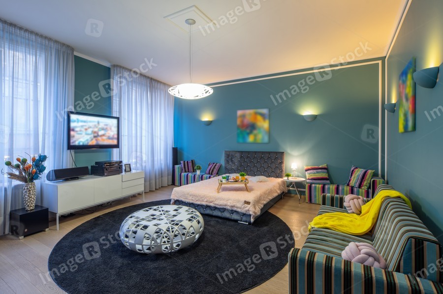 Modern interior of spacious studio apartment. Living room. King-size bed.
