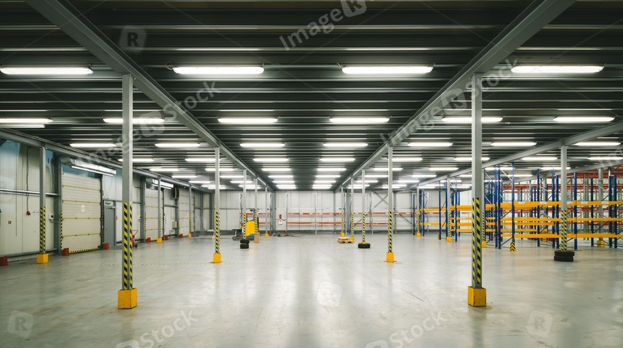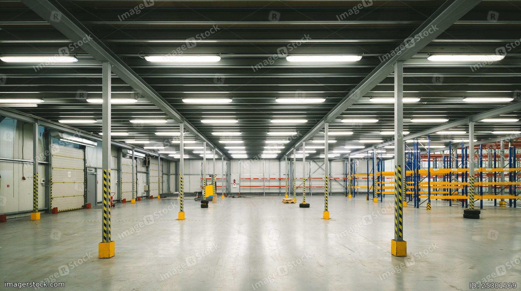 Interior of huge empty storehouse. Industrial warehouse racking.