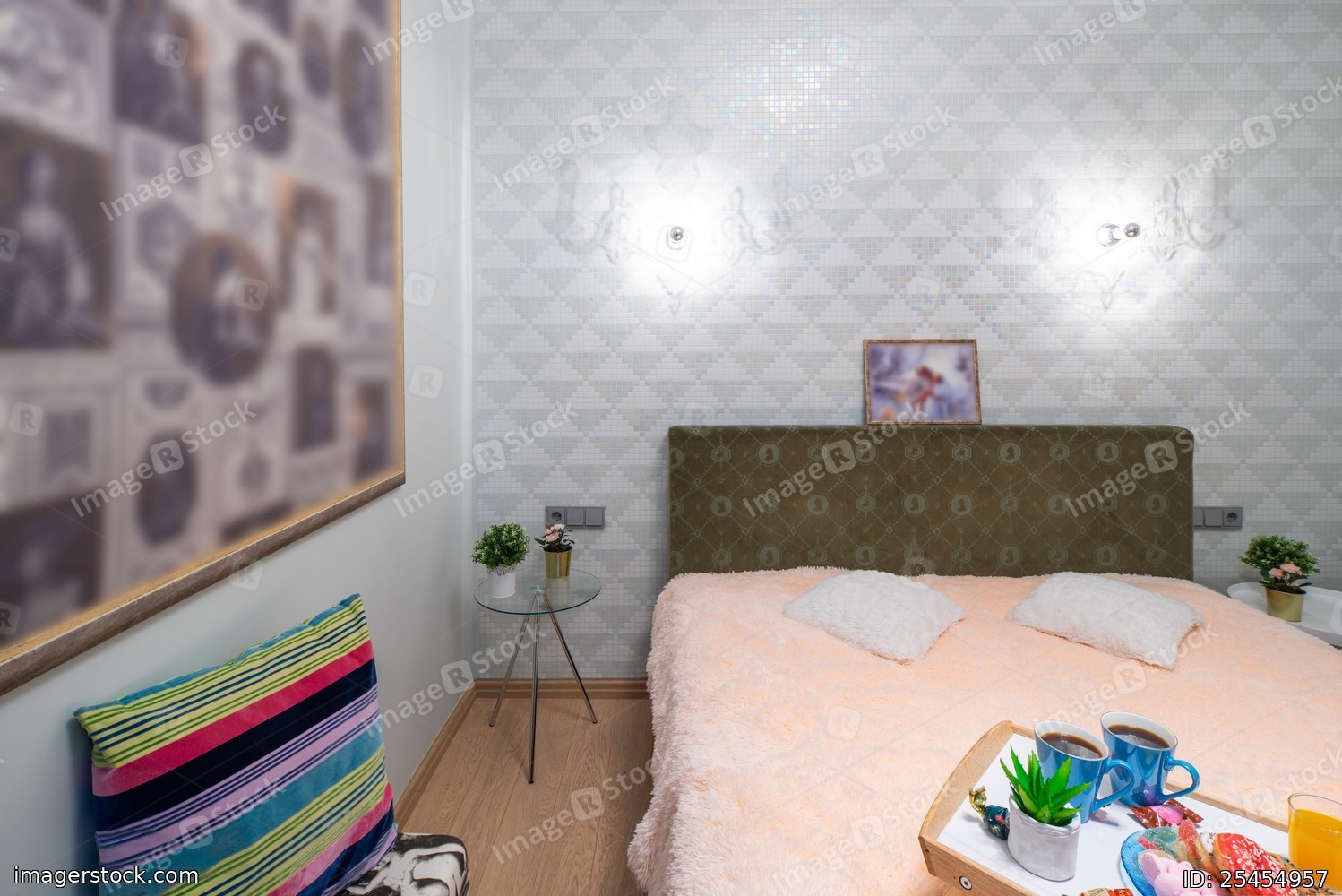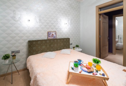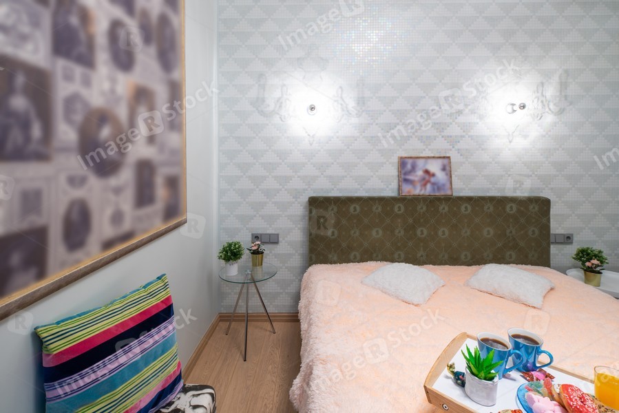 Modern interior of bedroom in studio apartment. King-size bed.