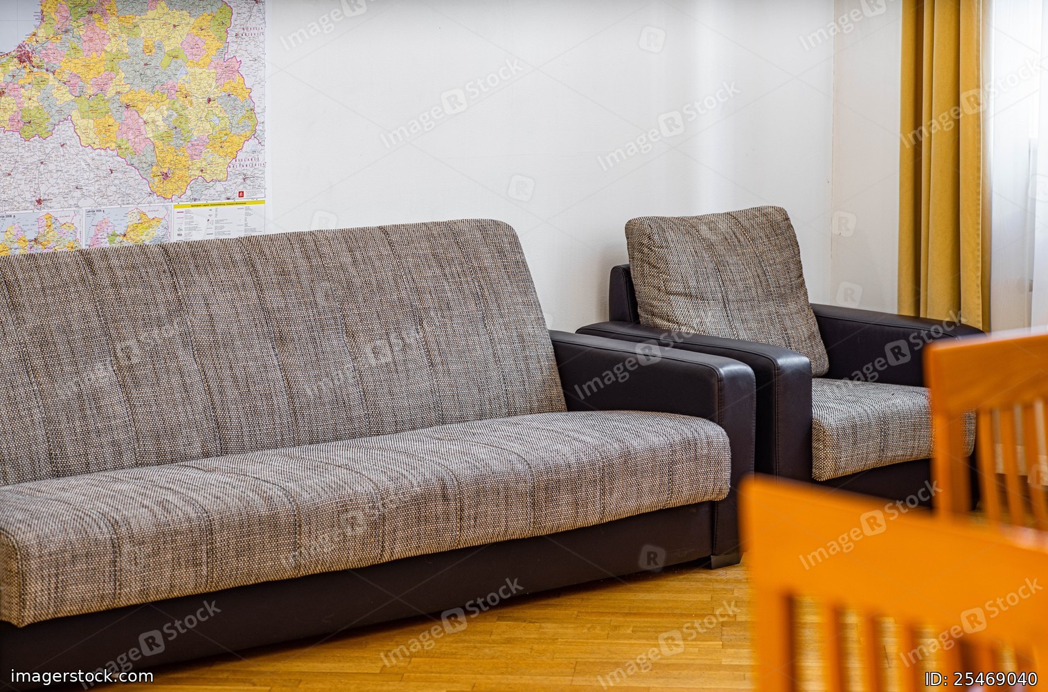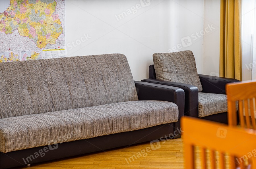 Furniture in private house. Sofa and chair. Close-up. White wall.