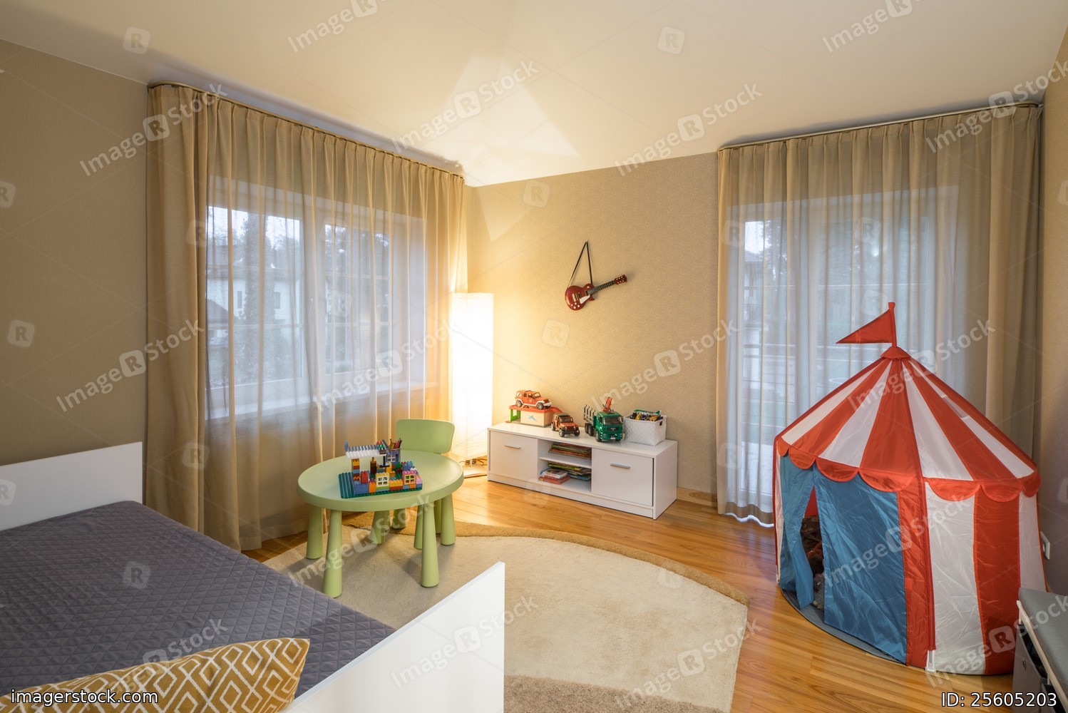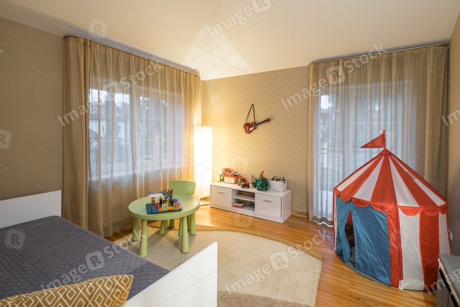 Cozy spacious child room with furniture and lamp.