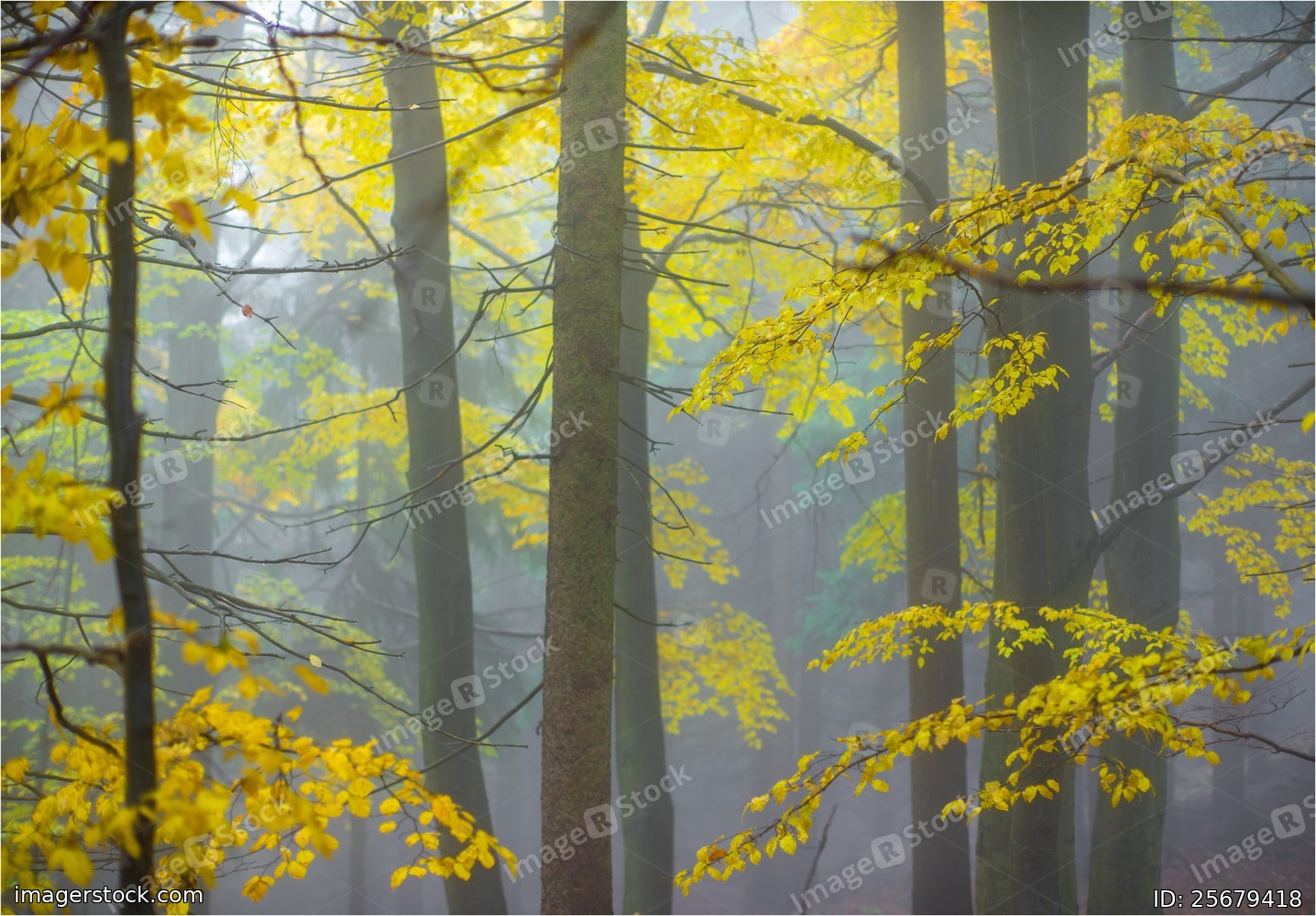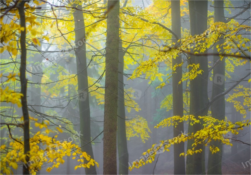 Autumn yellow forest with white fog.