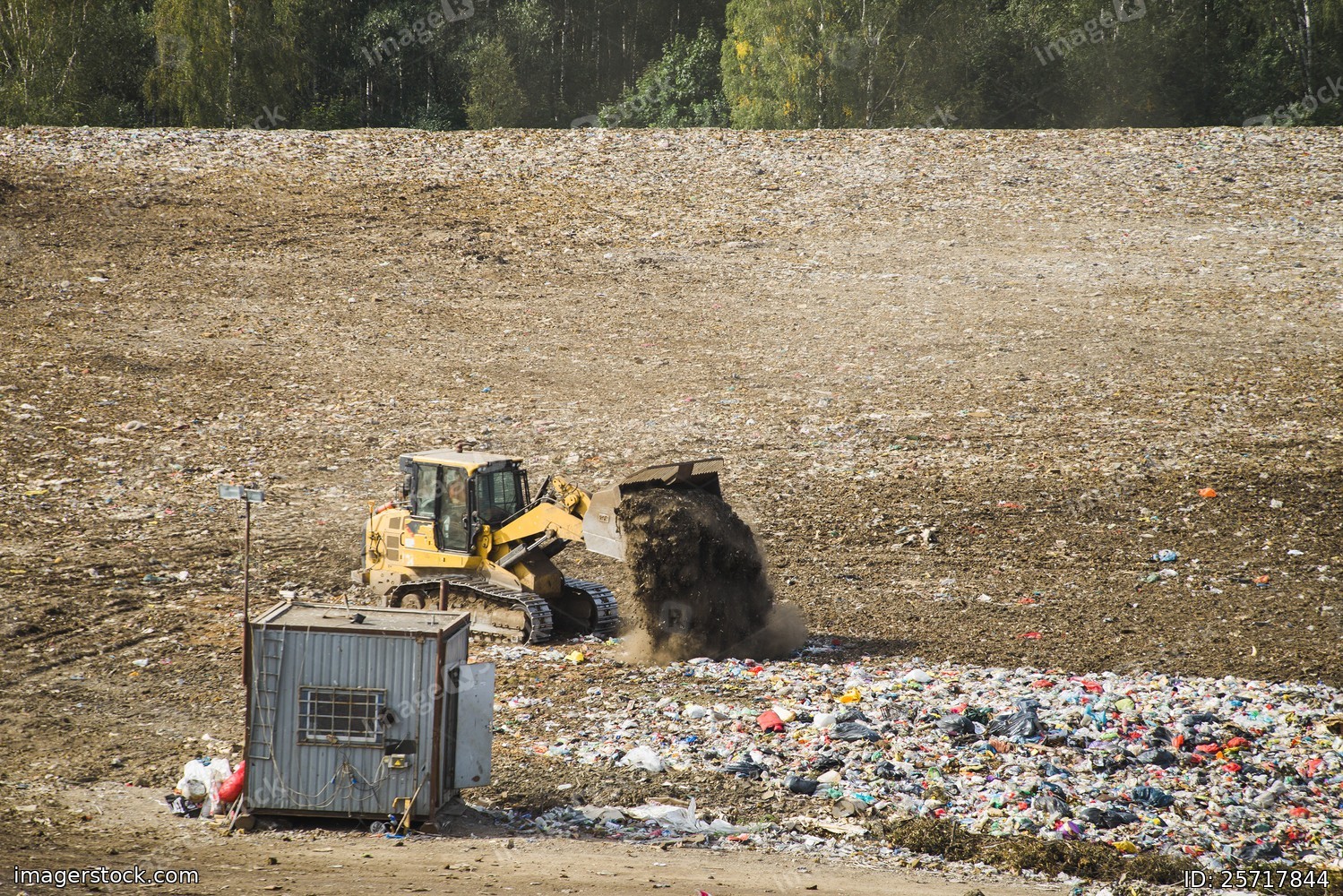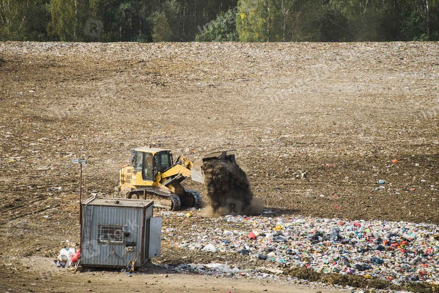 Yellow tractor loader works on huge landfill of big city. A lot of garbage on dump near forest. Waste sorting.