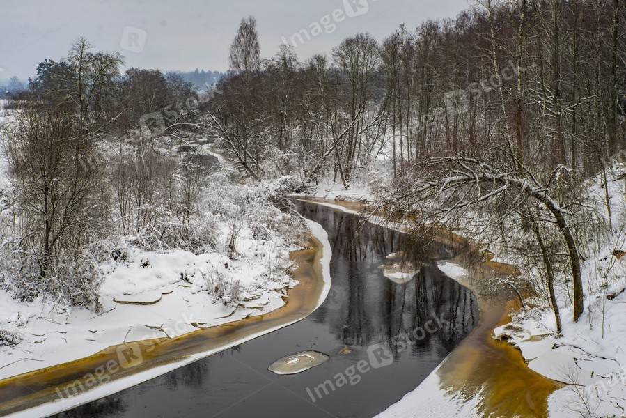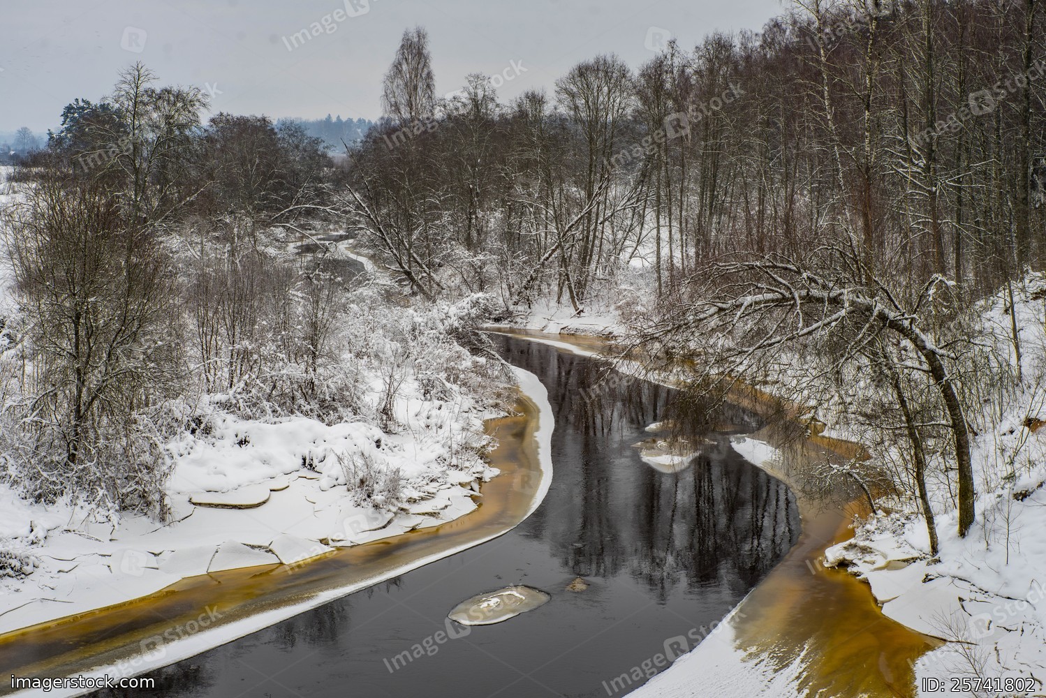 Winter scenery. Unfrozen river in snowy forest. Beautiful nature.