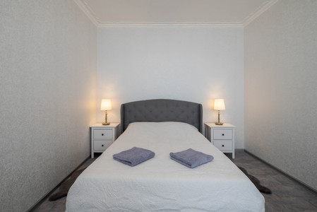 View on the entrance in modern interior bedroom with furniture.