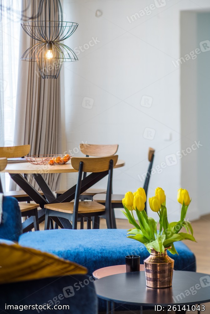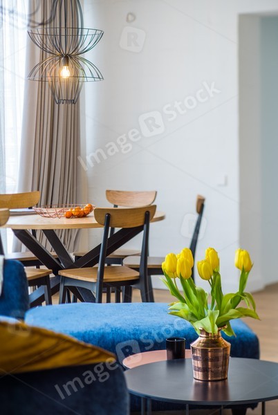 Interior of a modern apartment. Interior design, yellow tulips in a vase on the table.
