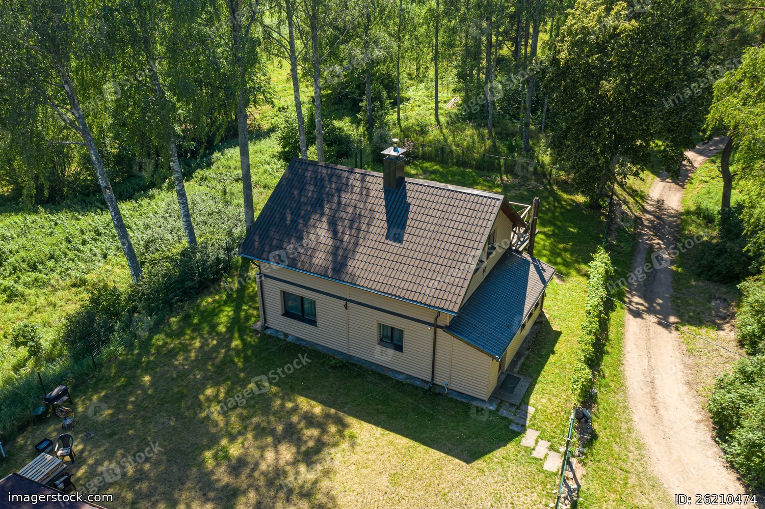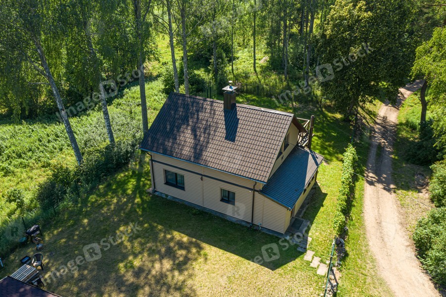 Top drone view of private country house between green trees. Sunny summer day. Modern exterior.
