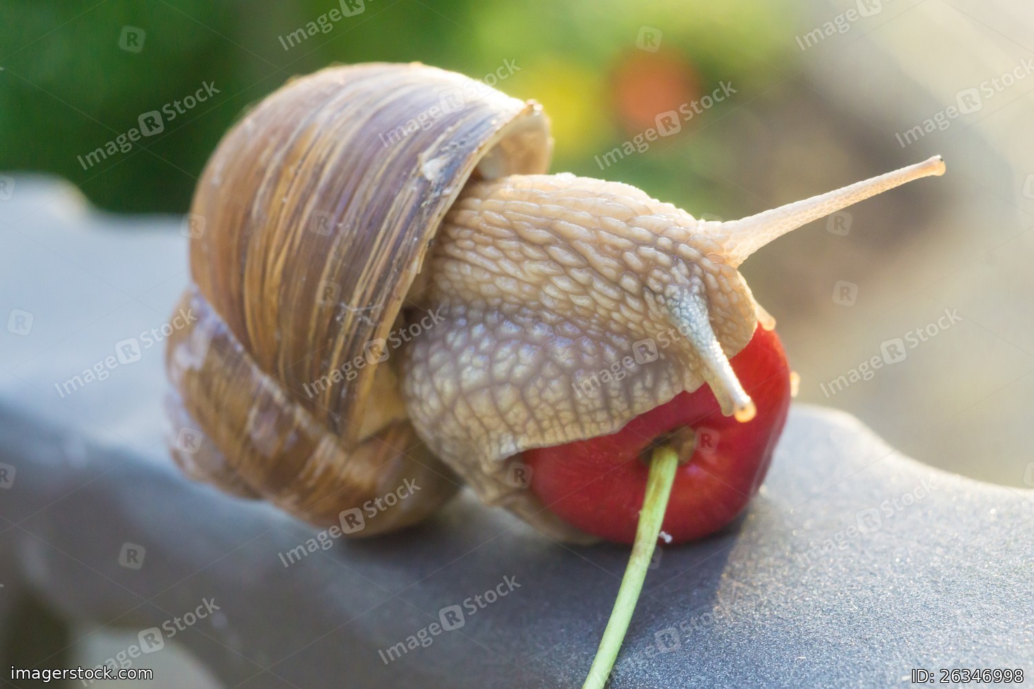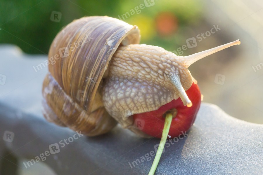 Big snail eating cherry berry in summer evening