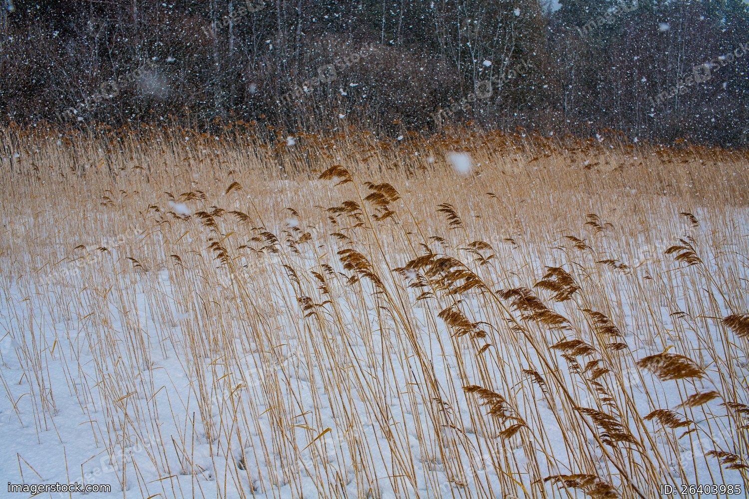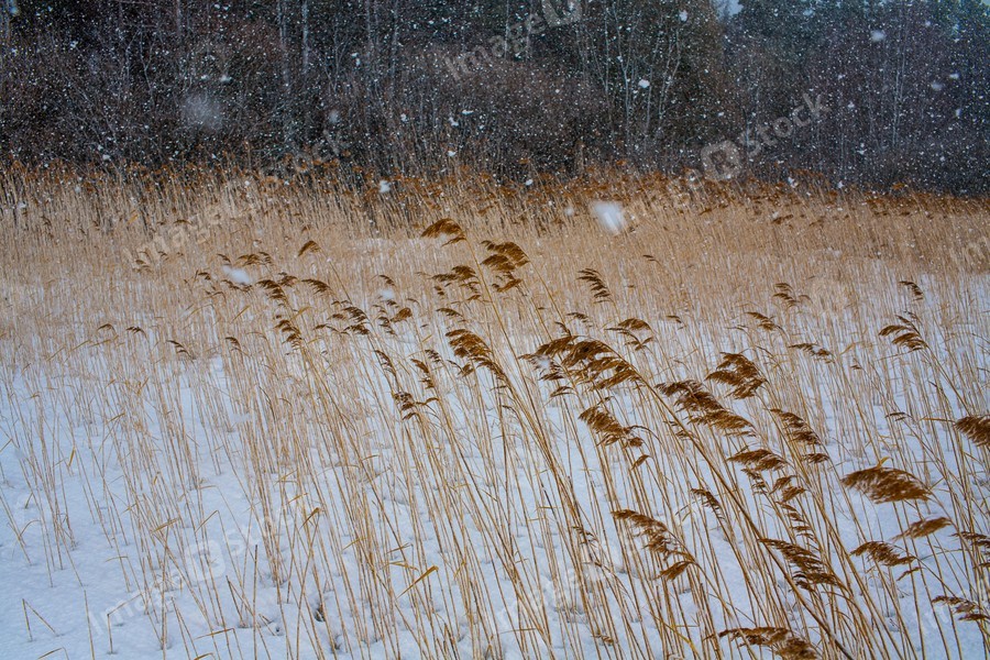 Snowfall, large snow flakes on the background of the forest and the lake.