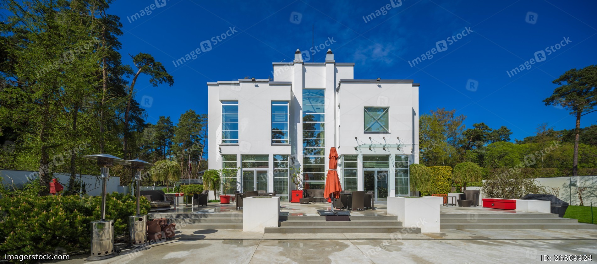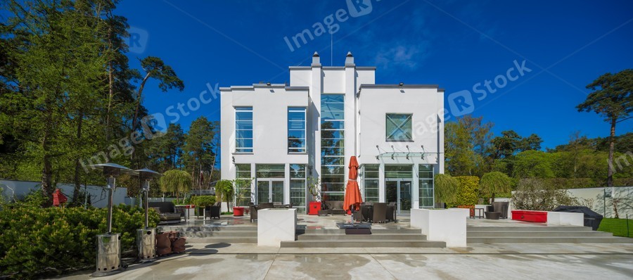Modern exterior of luxury private house. Facade. Sunny summer day.