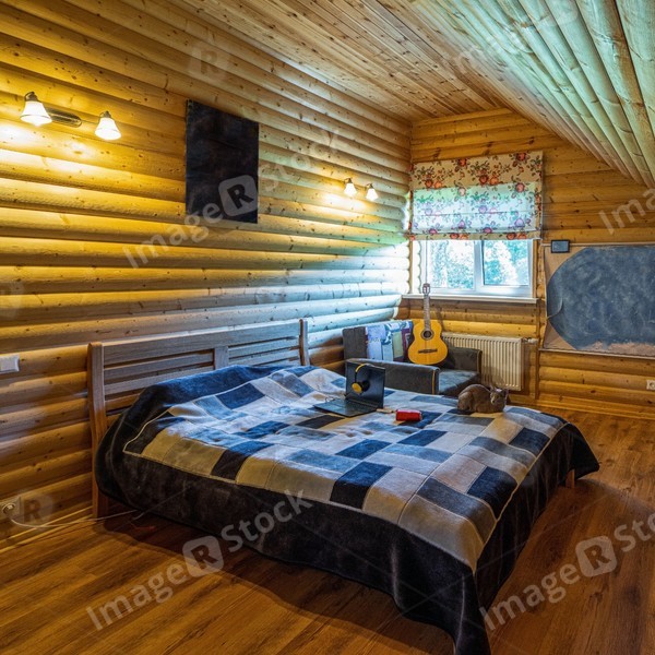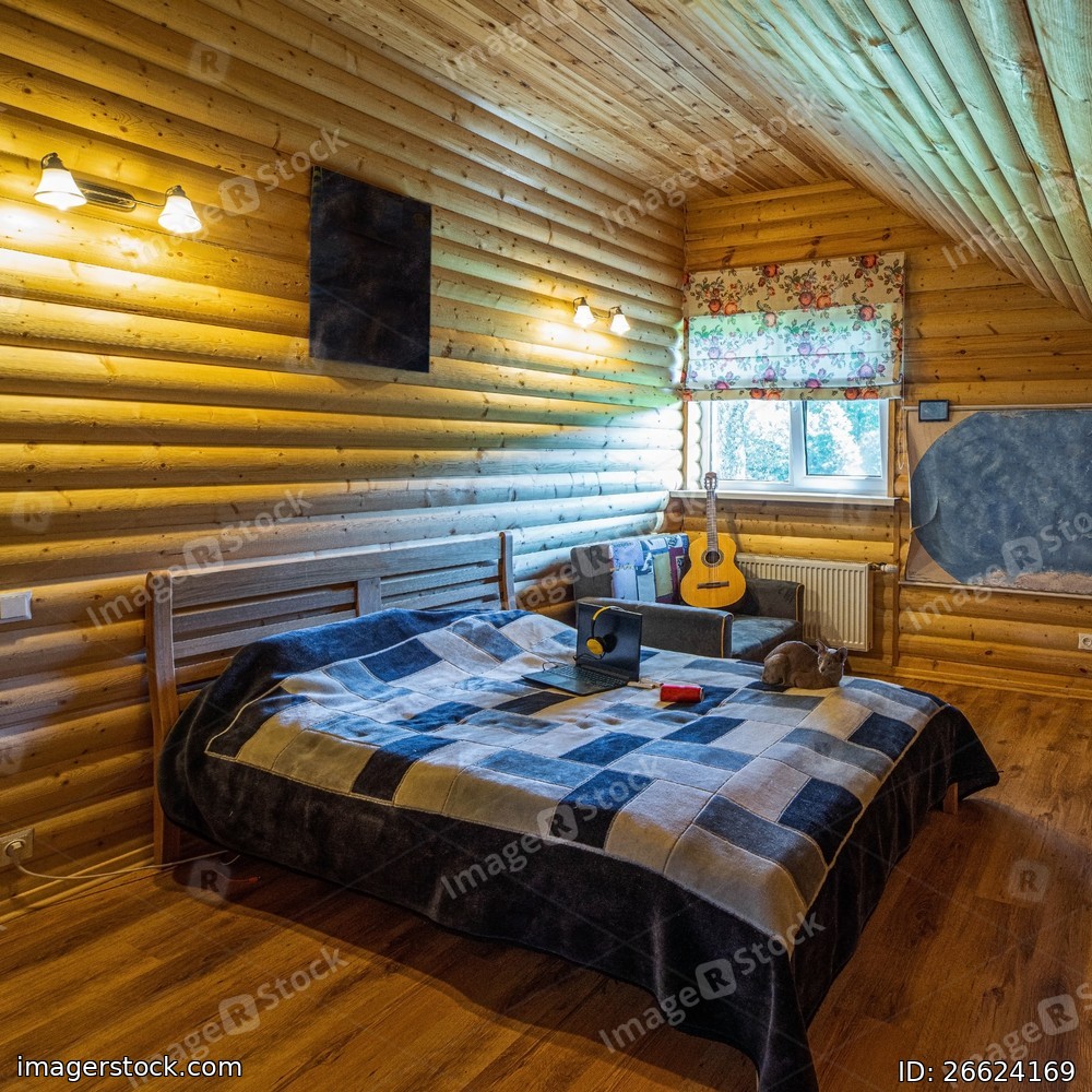 Eco wooden interior of attic teenager bedroom in private country house. Soft cozy bed. Cat Sphinx.