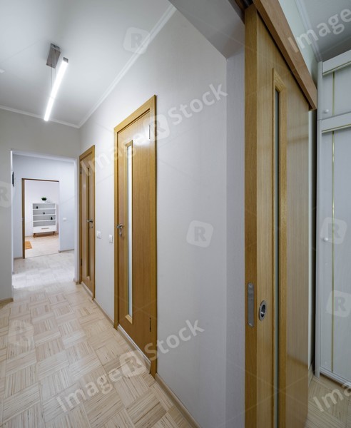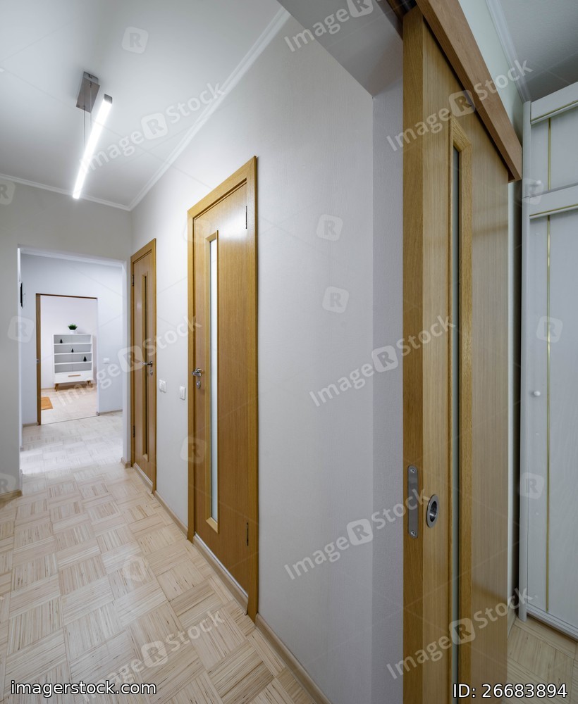 Contemporary interior of narrow hallway in modern apartment. Wooden doors. White walls. Living room.